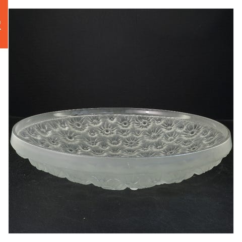 Dette er et dekorativt glasfad med en diameter på 28 cm. Fadet har indgraverede blomsterdesigns og prikmønstre, hvilket giver det et unikt og elegant udseende. Det kan bruges til servering eller som pyntegenstand i hjemmet.