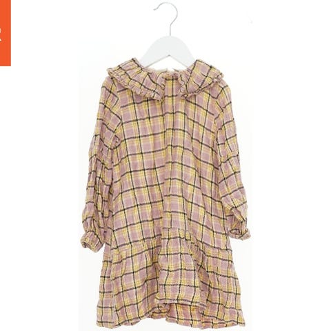 En lyseblå børnekjole med korte ærmer. Kjolen har et guldfarvet blomsterlignende mønster og tyl nederst. Den har en knaplukning bagpå ved nakken.