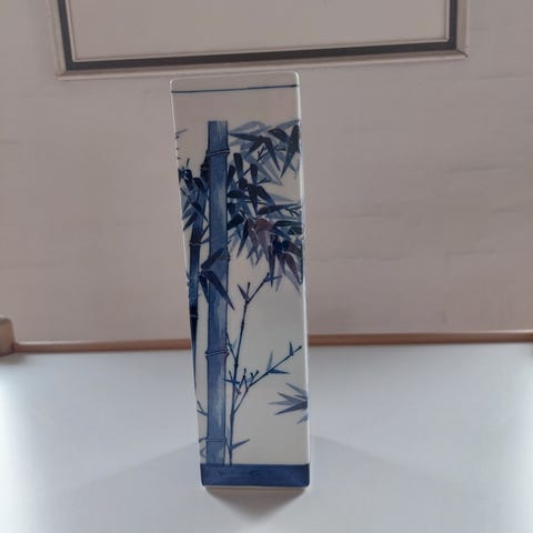 Denne sorte dekorative vase er 14 cm høj. Den er udsmykket med et naturnært motiv og er udstyret med et bambuslignende håndtag i brun farve på den ene side. Vasens design har et moderne og stilfuldt udtryk, hvilket gør den velegnet til forskellige dekorative formål i hjemmet. Brug den som en iøjnefaldende del af din indretning eller som en beholder til kunstige blomster og grene.