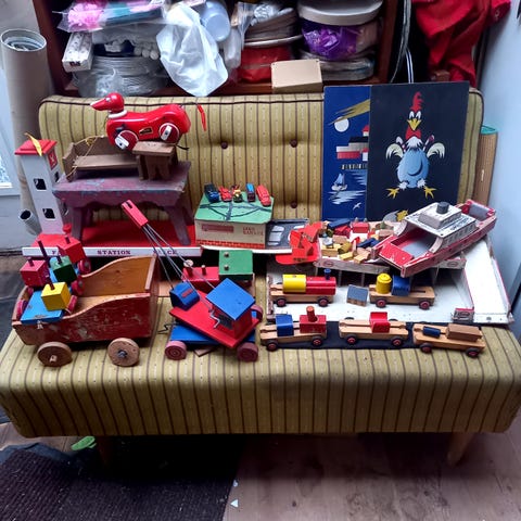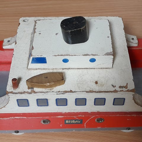 Bilofix (Lego) træfærge fra sidst i 50’erne. Pæn stand. Tre redningsbåde erstattet med vellignende kopier. Alt fungerer.