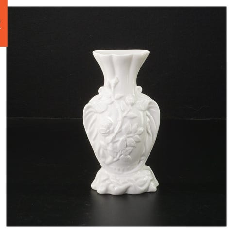 Vasen er lavet af porcelæn og har en hvid base med dekorationer af lyserøde og hvide roser samt grønne blade. Den har bølgede kanter og står på en lille fod. Indvendigt ses tegn på brug med noget misfarvning.