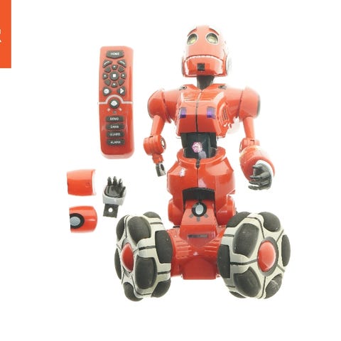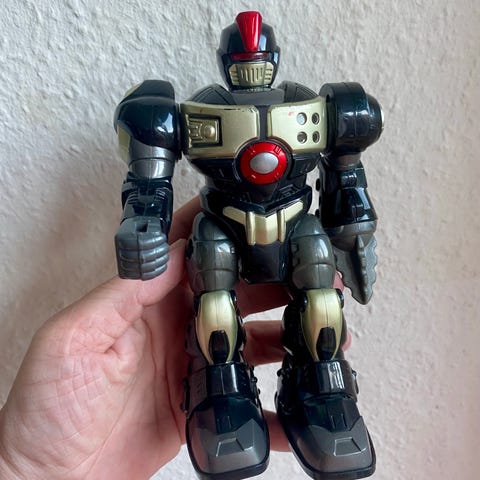 Dette er en rød robotlegetøj med grå detaljer, en størrelse på 18 cm, og hjul på fødderne. Den har bevægelige arme og ben, samt et geometrisk design på front- og bagsiden. Denne robot er beregnet til leg og kan være en del af en legetøjssamling.