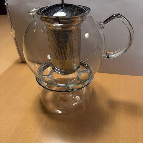 Denne genstand er en tekande med et glasindlæg og en tilhørende tefilter. Tekanden har en kapacitet der passer til små til mellemstore te-portioner. Den er udstyret med en blå lågåbning og blåt håndtag samt en blå base, der holder filteret. Filteret kan anvendes til at brygge te direkte i kanden. Der er også to mindre beholdere, der kan være en del af et te-sæt.