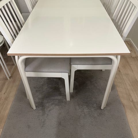Spisebordet fra JYSK med 6 stole. Enkelte ridser og slitage i bordplade og på stolerygge.