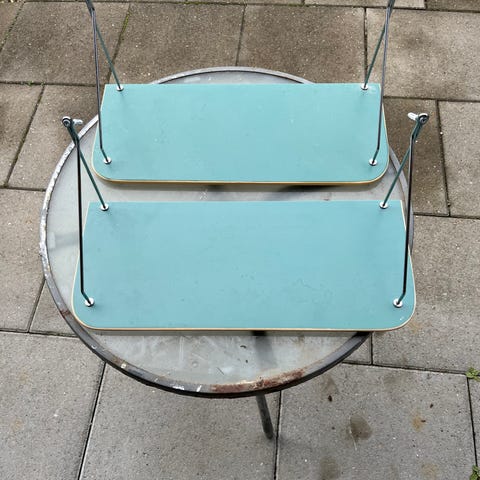 To vintage hylder i blå/grøn metal med krom. Hylderne har en enkel og funktionel konstruktion med metalhængsler.