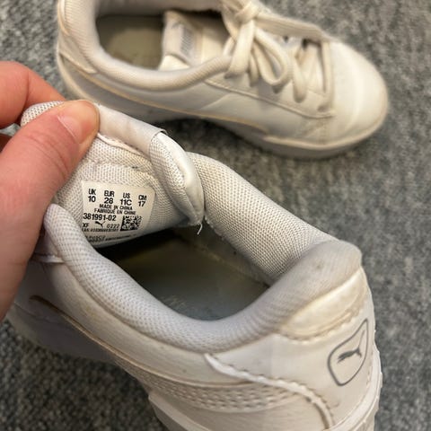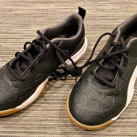 Puma børnesko til dreng i størrelse 35. Skoene er sorte med hvide detaljer og har snørebånd. De er designet til børn og egner sig til daglig brug. Kun brugt til ind sko