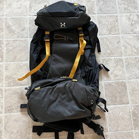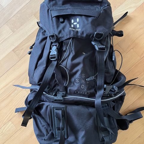 Haglöfs OXO rygsæk 70 liter til unisex brug lavet af stof. Tasken har flere justerbare stropper og lommer, velegnet til udendørs aktiviteter og rejser.