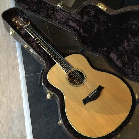 Taylor LLXSM 12-strenget guitar med cutaway design. Guitaren har en naturlig træfinish og er udstyret med tolv strenge, hvilket giver en rig og fyldig lyd. Instrumentet har en krop i træ med synlige årer og en hoved med guldfarvede stemmeskruer.