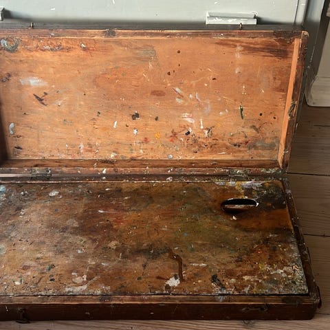 Ældre trækasse til maling og udstyr.