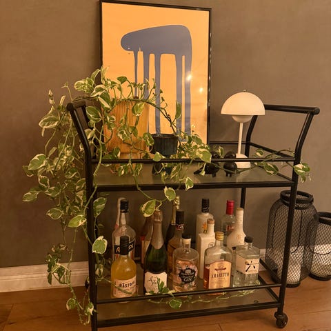 Barbord med træoverflade og metalstel. Bordet har en rektangulær form og en robust konstruktion, der egner sig til opbevaring og præsentation af flasker og drikkevarer.