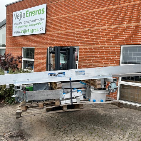 Damenberg Portalkran med en løftekapacitet på 3000 kg. Kranen har dimensioner på 3000 mm i bund, 4000 mm i top, 3760 mm i bredde og 1500 mm i dybde. Krogvandring er 2190 mm, og den har en orange talje med kædetalje og fjernbetjening. Konstruktionen er i gul stålstruktur. Dansk produceret.