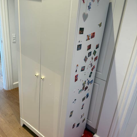 IKEA børnegarderobe i hvid med røde håndtag. Garderoben har to døre og en skuffe i bunden. Den er designet til opbevaring af børnetøj og passer til børneværelser.