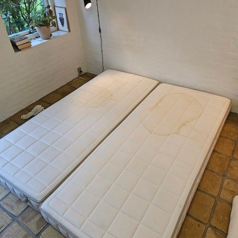 Auping (Maestro) madrasser med indbygget topmadrasser. Der er ingen pletter, og betrækket kan tages af og vaskes. De har været i brug i 6-7 år, og blev produceret i 2011.