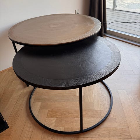 Sæt bestående af to runde borde med metalplader i henholdsvis guld og sort farve. Borde har sorte stel i metal med krydsforbindelser. Velegnet til brug som sideborde eller dekorative møbler i stue eller andre rum.