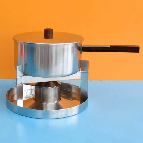Stelton fondue, sæt i rustfrit stål bestående af en gryde med håndtag og en holder med brænder. Designet til opvarmning og servering af fondue.