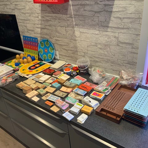 Globeludo og Halma brætspil med tilbehør inklusive spillebrikker og spillekort. Spil af forskellig type til bordbrug, velegnet til flere spillere. Materiale og specifikke størrelser er ikke angivet.