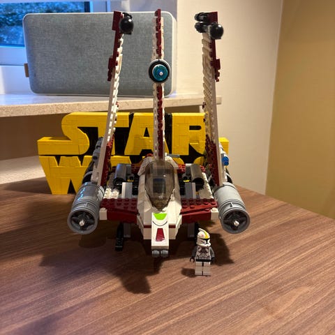 LEGO Star Wars rumskib 75104 med tilhørende minifigurer. Modellen er primært i grå og sort farve og består af mange LEGO-klodser. Rumskibet har åbent cockpit og detaljerede vinger. Sættet inkluderer flere figurer med tilbehør, som kan placeres i og omkring rumskibet.