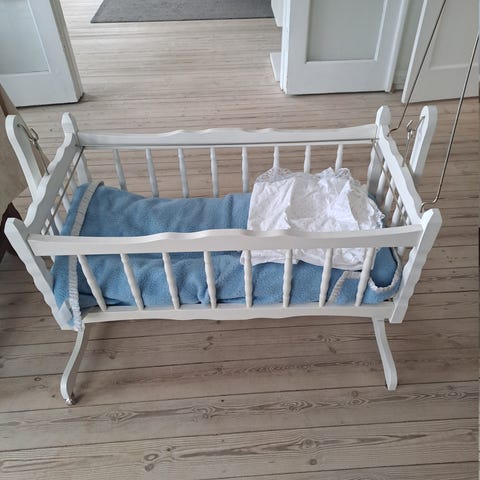 Ældre træ vugge I kraftig og solid udførelse. Hvid pigmenteret Medfølger madras og bøjle med himmel. Måler 90 lang 56 høj og 53 bred
