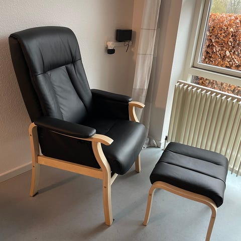 Lænestol med træramme og sorte læderhynder. Stolens design kombinerer naturligt træ med sort læder, hvilket giver et klassisk og enkelt udtryk.