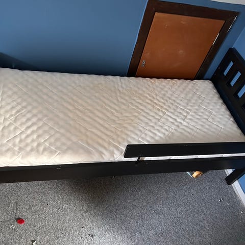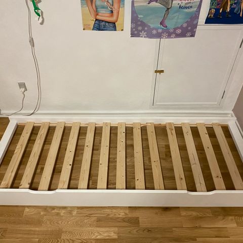 Hoppekids enkeltseng i hvid. Sengen har to praktiske skuffer til opbevaring under sengen. Egnet til børn og kan bruges i børneværelser.