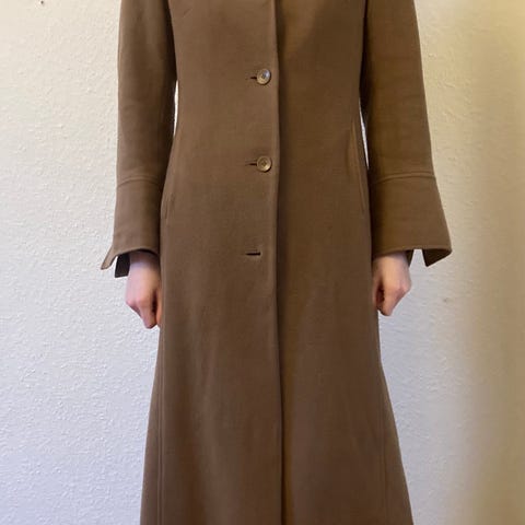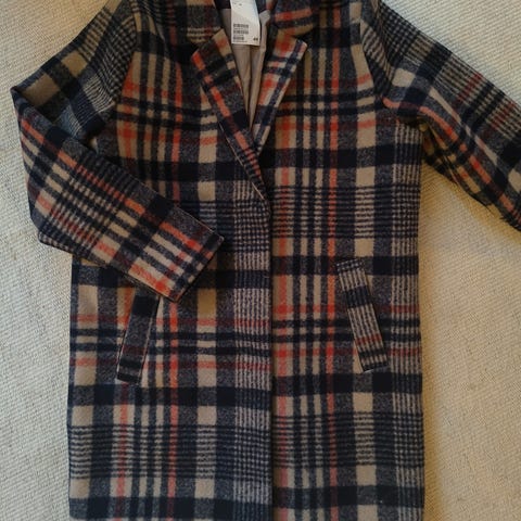 H&M frakke i uldmateriale, grøn farve. Frakken har dekorative guldknapper foran og på ærmerne, rund halsudskæring og lommer. Str. XL, men synes den er lille i størrelsen. Den måler 96 cm i længden og 53 cm fra ærmegab til ærmegab. Lukkes foran med skjulte trykknapper.