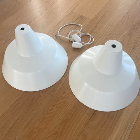 Vi sælger 4 stk hvide værkstedslampe fra Louis Poulsen. Rabat ved samlet køb.
