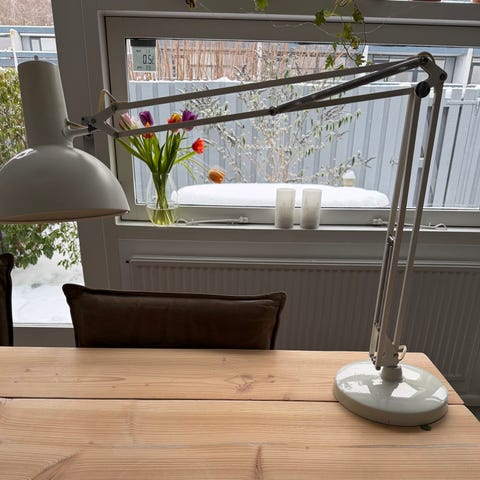 Klassisk bordlampe. DBA mener, den er fra Louis Poulsen. Diameter på skærm cirka 51 cm. Diameter på fod cirka 29 cm. Højde cirka 59 cm.