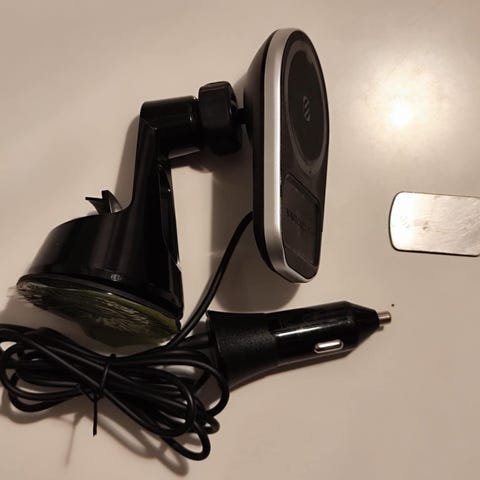 Samsung MagSafe trådløs oplader til bil med magnetisk fastgørelse. Designet til nem montering og opladning af kompatible smartphones under kørsel. Leveres med kabel til tilslutning.
