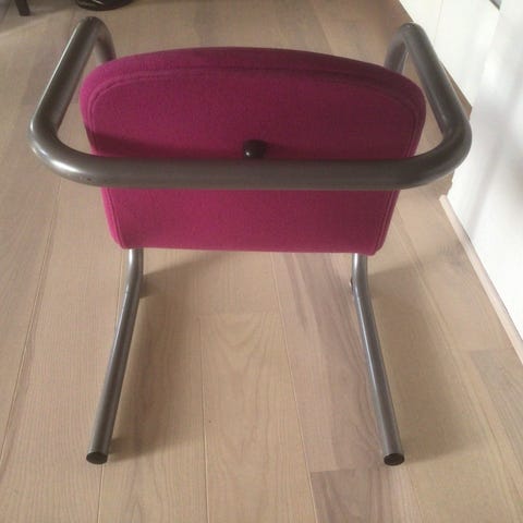 Ikoniske arkitekttegnede Friis & Moltke spisebordsstole fra 1979 i Aarhus - med patineret træsæde og rørstel i den klassiske røde farve. Standen er meget forskellige fra stol til stol. Anvendt i idrætsforening gennem mange år.