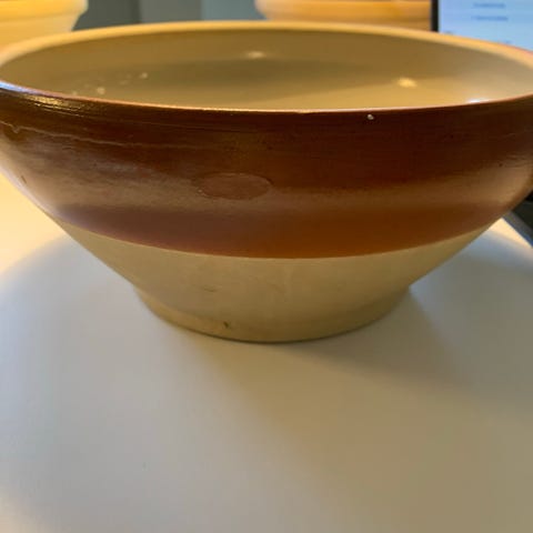 1 stort gammelt dejfad Holbæk Nr. 5. Glasuren er uden mærker og krakkeleringer. På ydersiden er der naturlige brugsspor (patina).