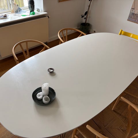 Rigtig flot og velholdt superelipse bord fra Piet Hein med udtræk. Den store model med bredde på 120 cm. Der medfølger to ekstra plader (60 cm hver) til bordet, som i fuld størrelse derved bliver 300 cm. Der sidder 12 personer godt om bordet og med lidt pressen sig sammen kan 14 personer lige være der.