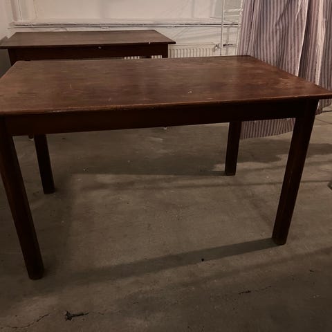 Brugt spisebord, trænger til en slibning men kan bruges mange år endnu, der følger to plade timer så man kan have 10-12 personer til middag.