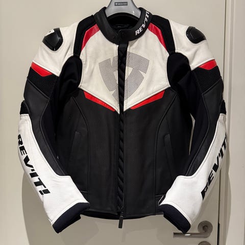 Jakken er størrelse 48 UK (58 EU) og inkluderer nakkebeskyttelse, skulderbeskyttelse, albuebeskyttelse og rygskjold