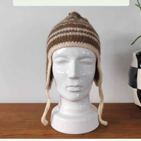 Øreklaphue håndstrikket i tyk uld. Varm, temperaturregulerende og isolerer, selv når det er fugtigt. Til børn eller til dig med en hovedomkreds mindre end 55 cm. Ubrugt. Du kan loppesjoppe den for 70 kr.