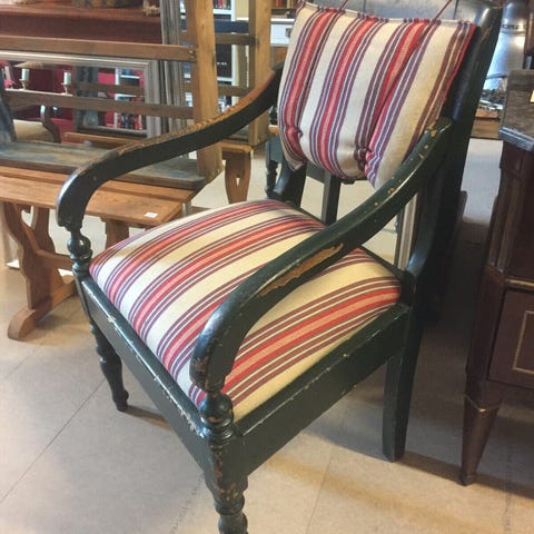 Der er revne/slid ved samling mellem sæde og ryg (se nærbillede) – stolen er stabil, men sælges som den er og egner sig bedst til let brug eller dekoration.