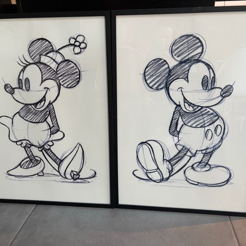 Disney Mickey Mouse og Pluto tegning fra 1939 samt Andeby tegning fra 1942. Begge er indrammet og viser klassiske figurer fra Disney universet i sort-hvid skitseform.
