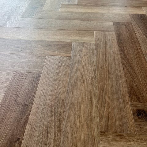 Gulvet måler 238mm i bredden, 1520mm i længden og 2,5 mm LVT med 0,55 mm slidlag.