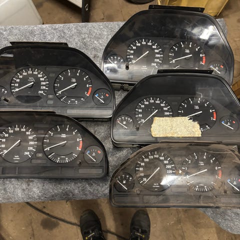 BMW instrumentpanel med speedometer, omdrejningstæller og brændstofmåler samt rat airbag modul med kontrolknapper. Komponenterne er originale og beregnet til BMW biler.