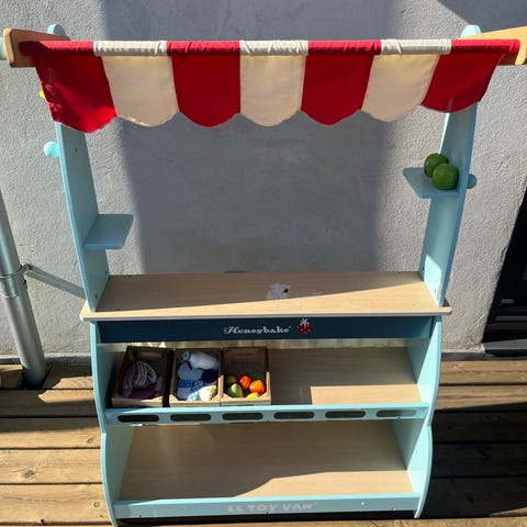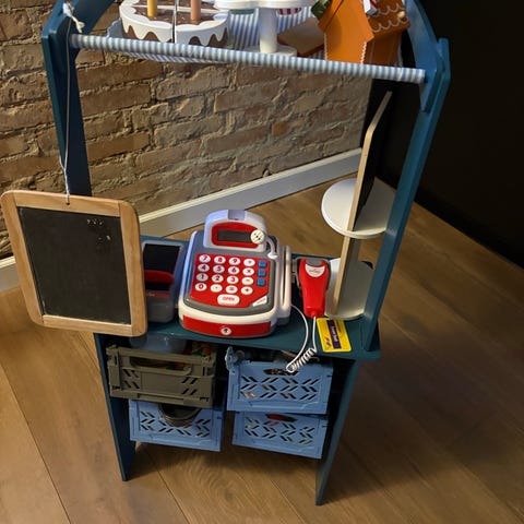 Vi havde egentlig tænkt os at sætte ben på - men har aldrig fået det gjort / har ikke været nødvendigt. 80 x 80 x 30cm. Med kassebånd og dankort automat. Der er blevet leget flittigt med den - men stadig næsten som ny. Ingen ridser / skader.