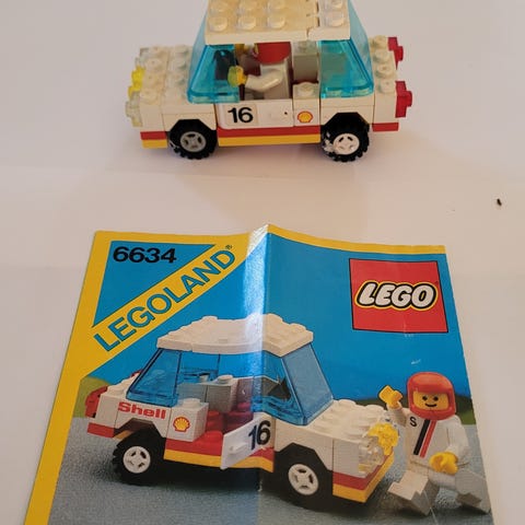 LEGO Legoland City 6502 terrængående bil i rød, blå og hvid med sort hjul. Modellen inkluderer en minifigur med hjelm, og bilen har fleksible slanger bagpå. Legetøjet er en del af LEGO City-serien og er velegnet til leg og samling.