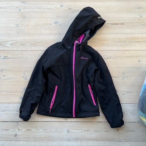 Icepeak softshell børnejakke til piger i størrelse 116. Jakken er sort. Den har hætte og lommer med lynlås.