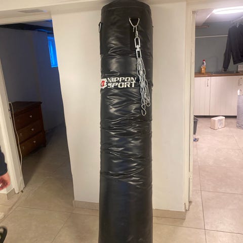 Outshock boksebold i sort og orange farve. Boksebolden har ophængningskroge og er lavet i slidstærkt materiale. Velegnet til træning og kampsport.