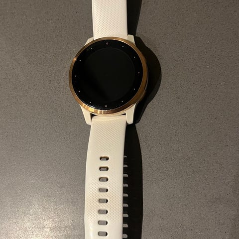 Garmin Vivoactive 4S smartwatch med hvid læderrem. Uret har en rund urskive med rosaguldfarvet ramme. Inkluderer opladerkabel. Designet til både mænd og kvinder.