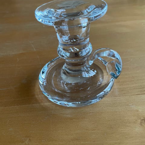 Pukeberg vintage lysestage fra 1970erne i klart glas med plads til to lys. Lysestagen har et enkelt og funktionelt design, der egner sig til dekoration og brug i hjemmet.