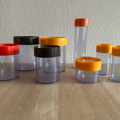 Velholdt opbevaring Erik Kold design. 6 stk sælges samlet. To store og 4 små. Ingen synlige brugsspor.
