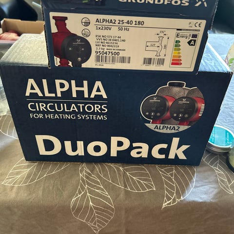 Grundfos ALPHA2 25-40 180 cirkulationspumpe er en særdeles energivenlig pumpe. Den er A-mærket og er fremstillet til cirkulation af væske i varmeanlæg. Indstilles pumpen på AUTOADAPT, vil pumpen køre op og ned i hastighed, alt efter hvor stort et flow, der er behov for. Så hvis man åbner en radiator kan man se på et display på pumpen, at energiforbruget stiger . Når man skruer ned for radiatoren vil energiforbruget til pumpen falde.