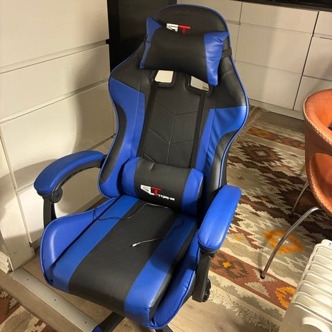 Extreme gamer stol med sort og rød farve. Stolen har en polstret sæde og rygstøtte med åbninger i ryggen. Den er udstyret med justerbare armlæn og hjul under sædet. Stolen har desuden en integreret USB-forbindelse til massage i ryggen.