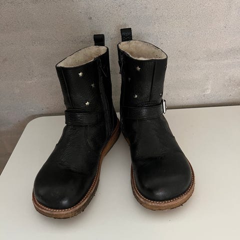 Super lækre vinterstøvler fra Angulus i sort læder og med uldfoer. Unisex. Min søn synes alligevel de er for store. Har kun prøvet dem på. De har lynlås som letter brugen.