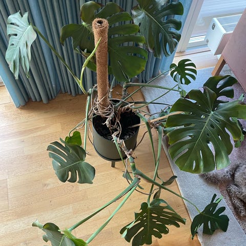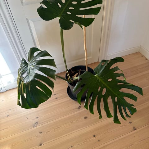 Potte med to monstera deliciosa fingerphilodendron planter med tre blade hver. Grøn plante egnet til indendørs brug. 105 cm høj, men kan blive stor, hvis man ønsker det - bladene er lidt mindre og end på den anden monstera, jeg har til salg - ca 30 cm i diameter. Potten medfølger ikke, men den kommer i en standard plastpotte. Sælges pga pladsmangel.