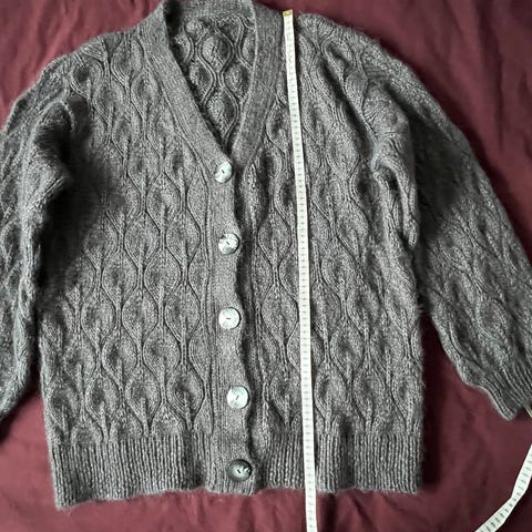 Det kan være lidt svært at gengive pasformen korrekt på billeder, så her har min datter (str. S/M) været model. Cardiganen er kun brugt et par gange og fremstår som ny strikket.